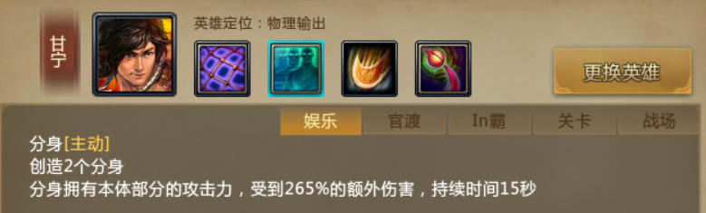 之所以这么说,是因为甘宁的二技能分身在游戏中效果是很不错的,虽然它本身受到的额外伤害很高,但是满级的时候可以继承本体高达75%的攻击力。如果甘宁选择属性装较多,对分身的加成是很明显的。后期几个分身加上甘宁的本体对付不能移动的建筑简直就是轻而易举的。