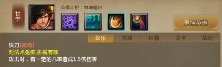优秀的属性以及被动,其使人残废特别适合追杀敌人的时候,而甘宁就特别需要。