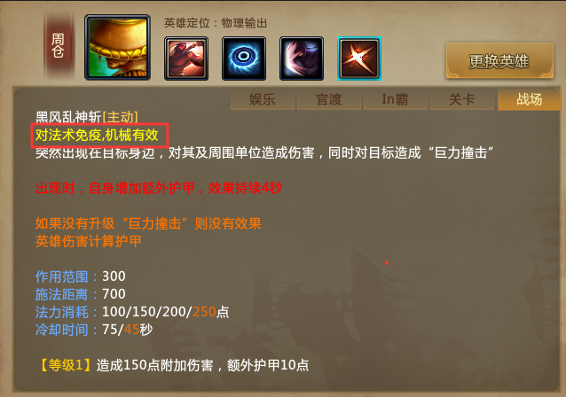 玩出征时间稍微长一点,大家都不难发现,如今这个地图中,除了张飞、张郃、乐进之外,其他近战输出英雄登场率都不怎么搞。偶尔有登场的时候,选择肉装思路的还是更多一些。周仓这个英雄虽然在传统竞技地图中输出能力不错,但在军团出征中没有足够的装备优势作用确实不怎么样。所以,实战中,我们不妨多多尝试一下纯肉的玩法思路。虽然纯肉之后伤害输出几乎没有了,但他的控制和辅助能力得到了极大的提升。有周仓存在的时候,E技能为周边队友带来的移速加成让团队机动性大大提升了不少,大招无视魔免的控制效果以及额外获得护甲值都可以让周仓成为一个单体控制的霸主级存在。虽然在团控能力上缺陷很大,但强大的单体控制能力,让拥有周仓的队伍再也不用担心遇到对面出现超级恶霸的情况了。