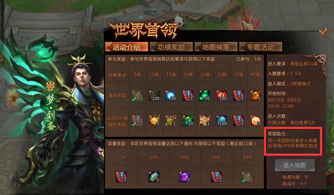 由于这次的世界首领地图中,同一军团玩家进入地图之后,可以获得20%的所有输出加成,和军团玩家一起组队游戏无疑是最佳选择。同时,又因为本身优势且强力的英雄就那么多,人多了分配起来反而显得有些麻烦,地图掉落又是根据个人伤害来判定的原因,同军团的两位玩家一起组队游戏无疑算得上是最佳选择。