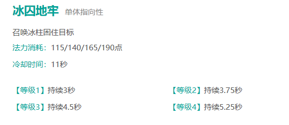 W技能:召唤冰柱捆住目标单位,无视敌我,这个技能可以被英雄特定技能和木灵符破坏。而且这个技能给敌方困住以后,偶尔可能会丢失敌方视野,敌方也可能会丢掉外面的视野,这个需要注意。