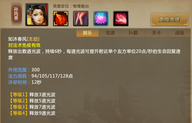 除了本身输出很高,孙尚香可以成为线霸还有一个很关键的因素,那就是它的恢复能力也是特别强大的,如沐春风提供的恢复能力在游戏中是数一数二的。所以就算是面对耗血能力强大的对手,孙尚香也完全不惧。而能够和她一样耗血强还恢复力强的英雄在游戏中几乎没有。