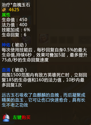 对于司马懿来说正统的路线应该是肉盾加奶妈,因此第一件装备的选择可以是能够大大提升自身生存以及回复能力的治疗*血魄玉石,它可以提供大量的回复能力,再配合司马懿的二技能,提升100%的回复效果,可以说是无限的回血回蓝了。