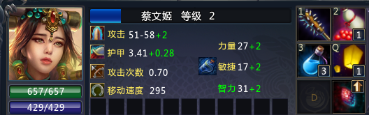 个人比较推荐大家选择的是补刀斧、金疮药(或大血药)、灵石、侦察灯加三个蓝的搭配。这样可以大幅度降低因为前期很有可能会频繁使用技能而带来的蓝量不足。之所以没有推荐大家多带血量补给道具,最根本原因还是蔡文姬是一个超远程消耗能力极强的英雄,会被对手消耗血量的时候其实并不多。并且,这个以消耗为主的英雄,需要与对手直接对拼的时候也并不算多,毕竟直接对拼蔡文姬基本拼不过别人。