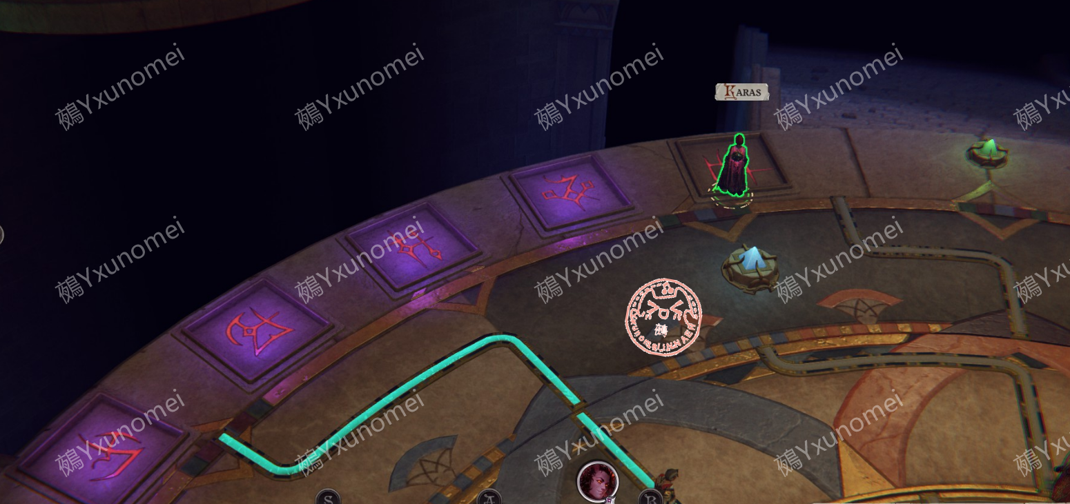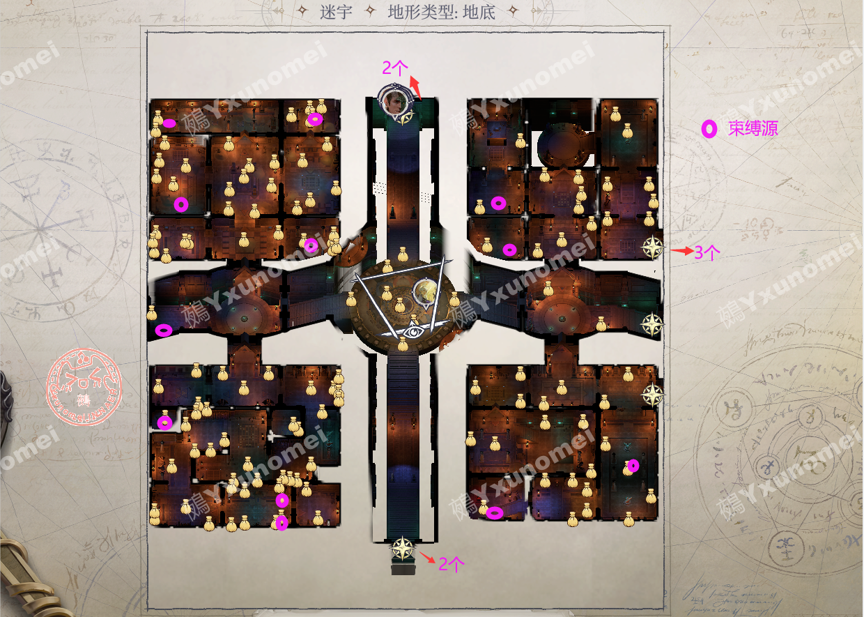 之后带着4蓝4红束缚源来到中间大圆盘。不需要转圈圈,将4个红色放在外圈(两个有连着地图左右两边魔泉的记得点亮了),蓝色放中间,边上4组符号每个都把最后一个踩灭(如图),