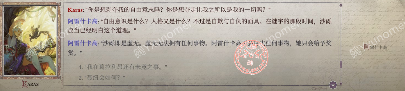 或②在谜宇的全程答错谜题或拒绝回答,在阿雷什卡高面前的对话选项如图
