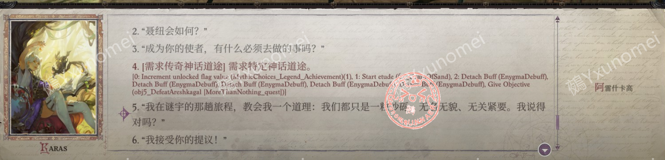 打完虚假的阿雷什卡高后进入传送门,与真实的阿雷什卡高对话时选择“你才是毫无价值的沙粒”。要出现这个选项需要①传奇道途,