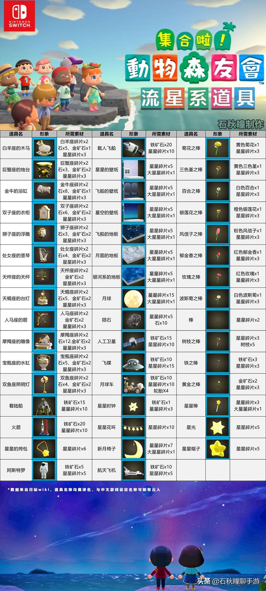 《动物森友会》已经发售一周了,晚上可以许愿流星这件事相信大家应该都已知晓。但还是很多人私信问我这些流星素材该怎么用?怎么做星星棒?我查了一下网上的攻略,发现关于流星这方面的攻略都不够深入,只教你许愿流星的基本操作,所以我去外网搜集了相关资料,相信全网再没有比我这篇攻略更详细的了。