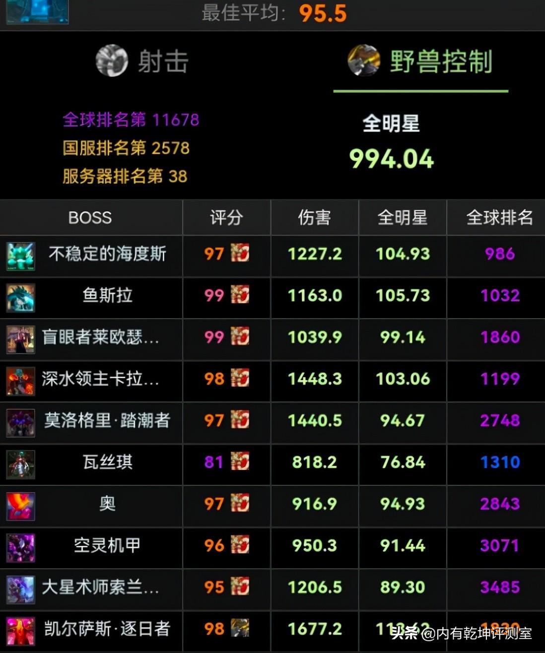WCL更多是体现了同职业秒伤高低,虽然高的数据不一定是真的高,但数据低的肯定是真低,是不是很绕?WCL会记录历史最高值,更多的用于同天赋对比,如果用某类天赋的玩家比较少,那么分数就很可能非常高,但这并不能代表某个玩家的真实水平,换成比较好理解的一句话就是你觉得很菜鸡的队友,很可能是头部10%的猎人,而你觉得很厉害的术士,反而可能是能力低于半数术士的菜鸟。