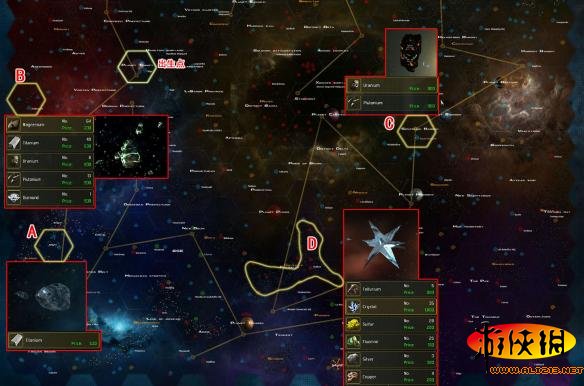 这种小行星只出铀和钚,均价都是900,不出杂矿. 图中c的星区是个很不错的矿点,比较安全,离太空站也近,开个货舱100的护卫舰挖的话,挖得挺快的,一船能卖9万左右。