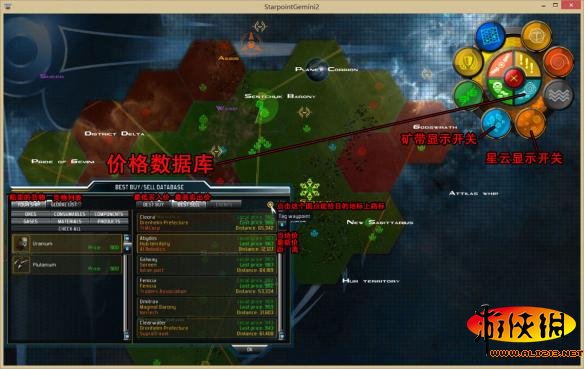 打开地图后,可以点击右上角的价格数据库,可以让你查询查矿价. 点Best Sell可以查到你船舱内矿物在哪里卖得最好,然后点列表右上的圆点就能在星图上标上路标. 这也是跑商的方法。