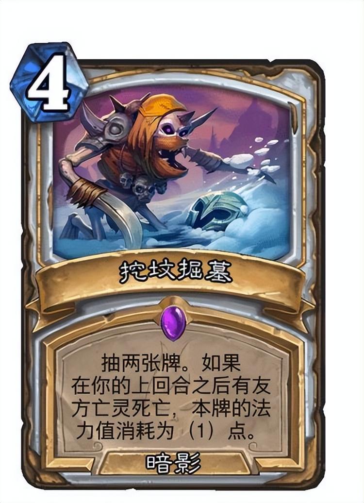 神卡,暗影属性可以配合大主教,稍微优化暗牧构筑下就约等于一费过二,非常适合快攻亡灵暗牧。是亡者复生退环境后最适合暗牧的过牌。