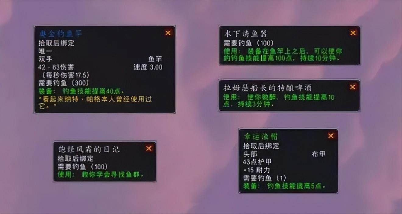 海湾渔靴:钓鱼技能提高15点。将使用者传送到藏宝海湾最高档的酒肆,1天冷却。