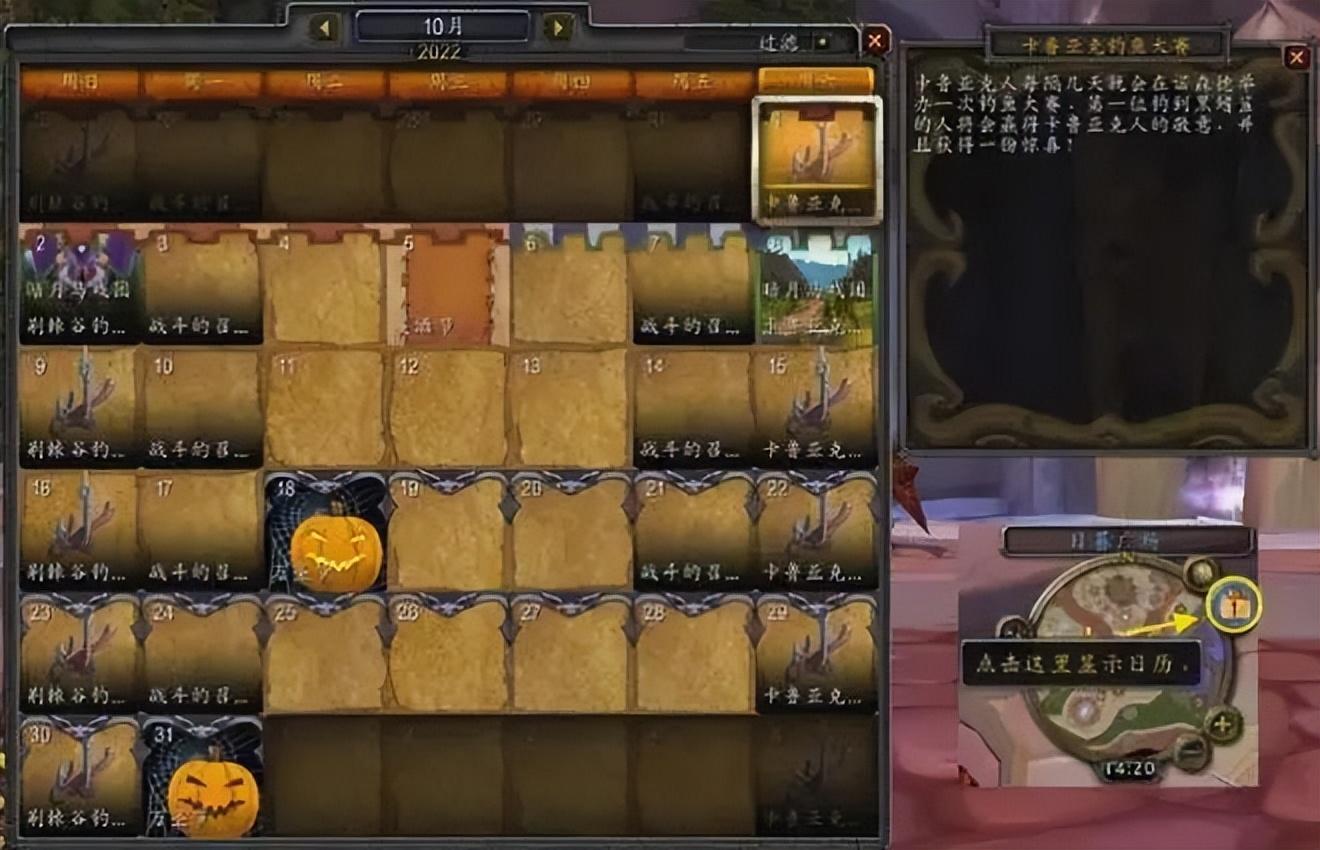 巫妖王之怒版本加入的日历功能,能让我们直观的了解钓鱼大赛的时间与要求,点击小地图右上角的日历查看,如下图所示(箭头指向黄圈处)