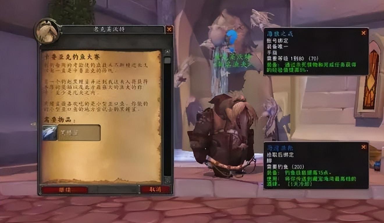 如果错过了第一名,老克莱沃特的任务会变更为【祝下次好运】,交付黑鳍鲨时,可以获得150点卡鲁亚克声望和一袋钓鱼宝藏。
