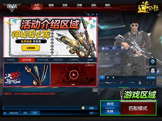 要说变动幅度最大的无疑是大厅界面,现今正服中的大厅界面以游戏模式的选择为主要板块,而新的大厅界面则已活动介绍板块为主(玩家可以从中了解最新的活动咨询以及直链逆战视频库观看视频),至于游戏区域则进行了精简并且移至右下角(找频道开房、组队匹配以及打天梯都由此进入),从而对于玩家们来说在新的大厅界面中可以很轻松的了解到活动相关内容,相对的想要进行游戏则会变得复杂一些。