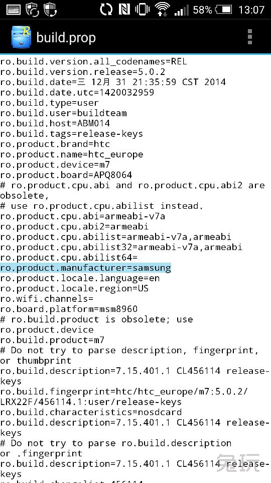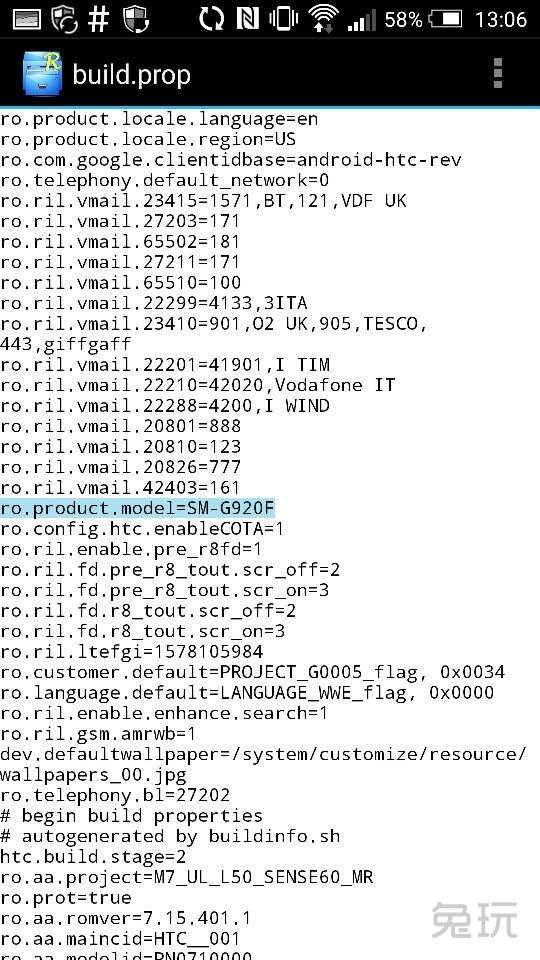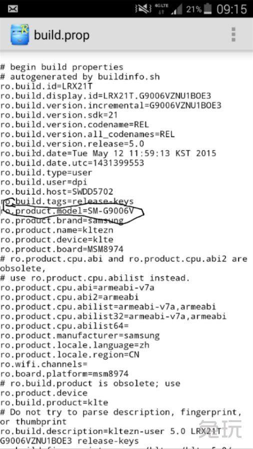 打开re,在系统根目录下找到System文件夹,进入找到build.prop文件,长按选择以文本编辑器方式打开!找到ro.product.model=(SM-G9006V)括号里是你的手机型号,楼主是S5.