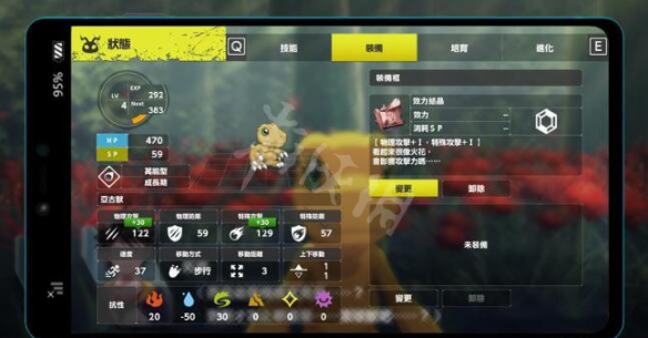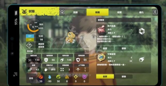 选择变更就能设定装备,优质的装备可以让主力数码宝贝拥有强大的战力(推荐优先发育主角及2、3个配角的数码宝贝)。