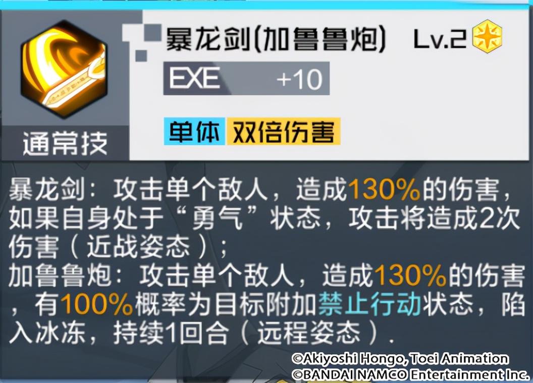 技能解析:伤害可观的通常技,近战姿态下可以造成2次攻击,总伤害几乎可以跟一些低消耗奥义技持平;远程姿态下有100%的概率使目标陷入冰冻状态。