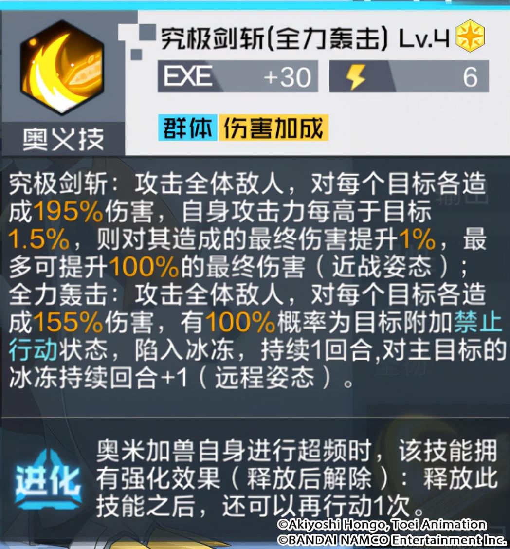 技能解析:奥义技在近战姿态下拥有不俗的伤害能力,且能根据自身攻击力高于目标攻击力的数值额外造成更多伤害;在远程姿态下,能对敌方全体造成冰冻控制。
