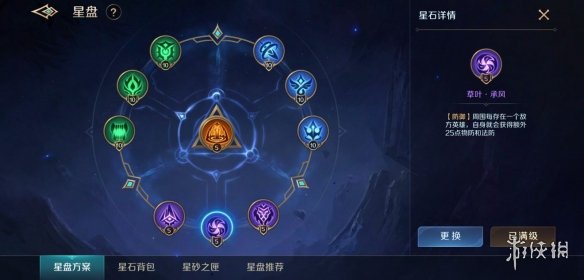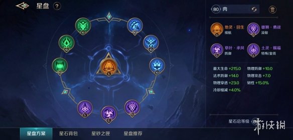 星盘我推荐这套纯肉星盘,本套星盘的最大亮点是出门就很肉。每次升级都会恢复15%最大生命值血量,满级更是能提供965额外生命值(相当于一件防御神装),有了这套星盘,在对抗中让你的对手怀疑人生。抗揍到让人看不懂!