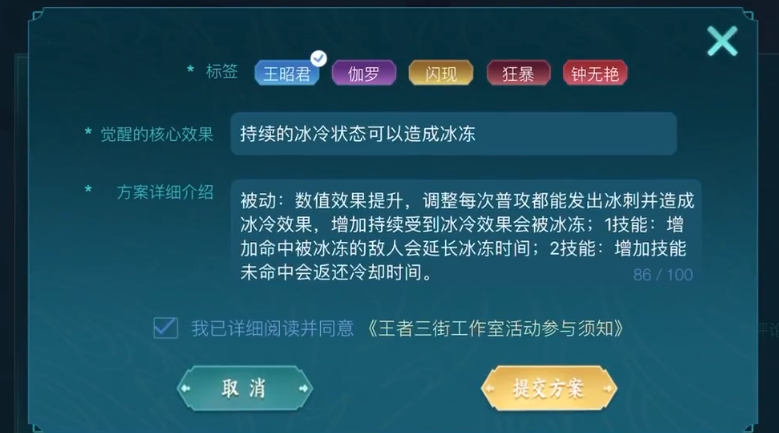 举个例子来说,王昭君的英雄定位是控制以及爆发,那么玩家就可以在设计英雄技能时着力考虑这两个方面。比如一技能的前摇过长,可以在加强版中缩短前摇时间,大招范围性多段伤害则可以改成跟随人物移动化身移动风暴旋涡。至于伽罗也可以根据特性增长大招内狂暴的持续时间。钟无艳这样一名战士则可以在机动性方面做出适时调整。