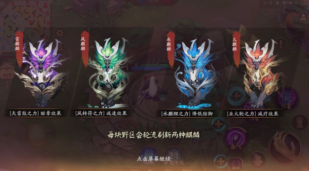 进入对局后,大家会发现地图的四处BUFF点当中刷新的麒麟配色是不同的,在这里需要跟大家说一下,BUFF麒麟共分四种,分别是业火轮,水灵鲤,天雷鼓,风转符。每一种麒麟在被击杀后,都会在限定时间内为击杀这着提供BUFF加成,当BUFF玩家被其他玩家击杀后,效果也会相应转移,依此类推,这点与大部分主流MOBA游戏设定相同,但平安京有别于大众之处就在于这四类BUFF的加成各不相同: