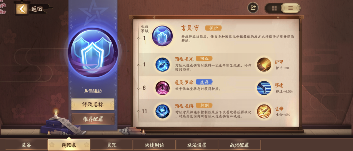 尽管肉辅看着很憋屈,但在很多场合他们也堪大用,我们主要先以兵俑这一较为标准的“肉辅”来作说明,阴阳术方面无需过多着魔,标准的坦系思路,唯一值得一提的是在11级生效的阴阳术上,我较为倾向于使用【预兆·星缚】,而不是大家常用的【通灵·续命】,这是因为我觉得兵俑,海坊主这类的减速技CD很短,运用星缚可以高频次地触发增伤效果,至于续命,兵俑技能放空后留在场上的用处就不大了,不太可能成为对方集火目标,故此意义不大。