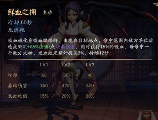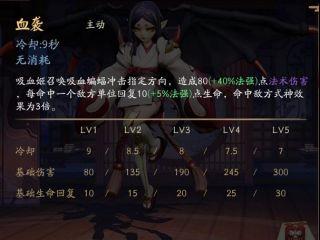主要的消耗和主动回血技能,升级减冷却时间,结合吸血姬无蓝条的特性,释放成本很低,无论对线还是团战poke(远程消耗)都会使对面非常难受(特别是有了山吹的情况下)