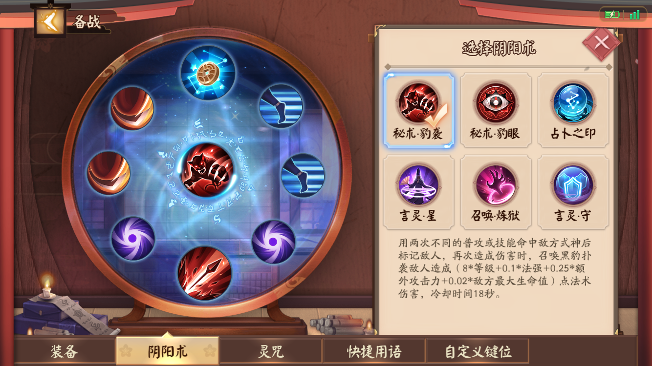 阴阳术还是推荐压制力最足的豹袭套路。初级分别找攻击、移速、CDR,中级选择影狩提高线上和阴人能力,也可以考虑追袭。点金是万金油天赋,根据喜好选择唐伞和狐火都是没问题的。大阴阳自然是豹袭,伤害的第一来源。