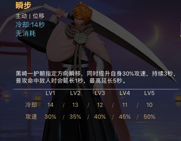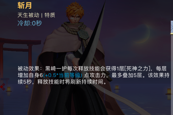 天生被动:斩月,每次释放技能会获得一层死神之力,每层提供攻击加成,最多叠加5层,持续5秒,释放技能时刷新持续时间。