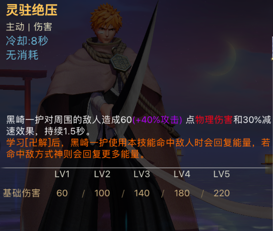 一技能:灵驻绝压,对周围敌人造成物理伤害和减速效果,持续1.5秒。在学习大招【卍解】后,命中敌人后会回复能量,命中敌方式神回复能量增加。