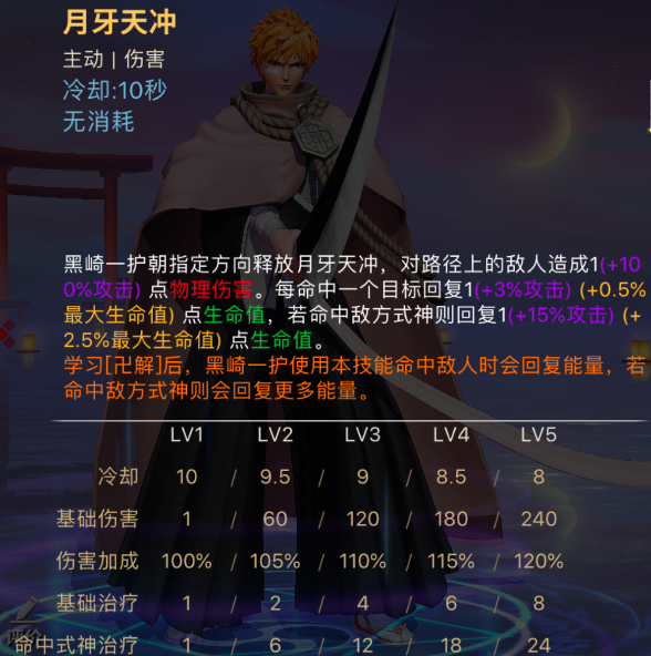二技能:月牙天冲,朝指定方向释放月牙天冲,对路径上的敌人造成物理伤害,每命中一个目标会给自身回复生命值,命中敌方式神回复量增加。在学习【卍解】后,使用该技能命中敌人时会回复能量,命中敌方式神回复能量增加。