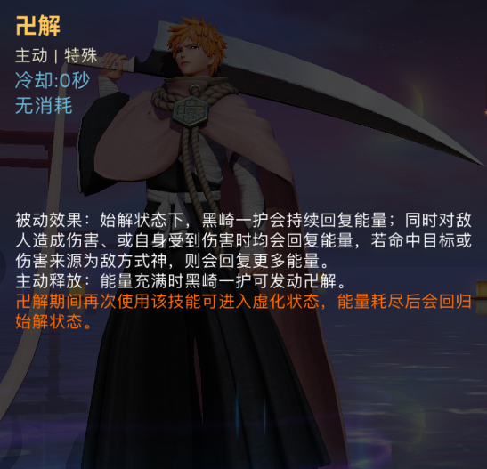 终极技能:卍解,分为两种效果,首先被动效果为始解状态下,黑崎一护会持续回复能量,同时对敌方造成伤害或者自身受到伤害时均会回复能量,命中敌方式神或者伤害来源为敌方式神,回复能量增加。主动释放效果为能量充满时,黑崎一护可发动卍解。卍解期间再次使用该技能可进入虚化状态,能太耗尽后会回归始解状态。