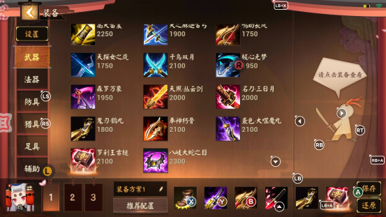千鸟双月/罗刹王古槌/灭绝太典太:这三件装备可以根据局势来选择,前者在刺客多的时候出,强化生存能力;古槌在控制多的时候出,获得输出空间/后者就是比较中庸的一件装备,任何局势都可以考虑。