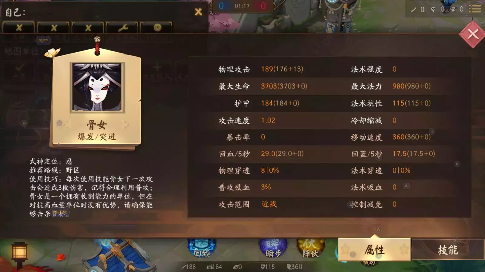 也就是说骨女满级是1851血量,92护甲,94.5攻击,57.5魔抗,1.0攻速,360刺客速度。
