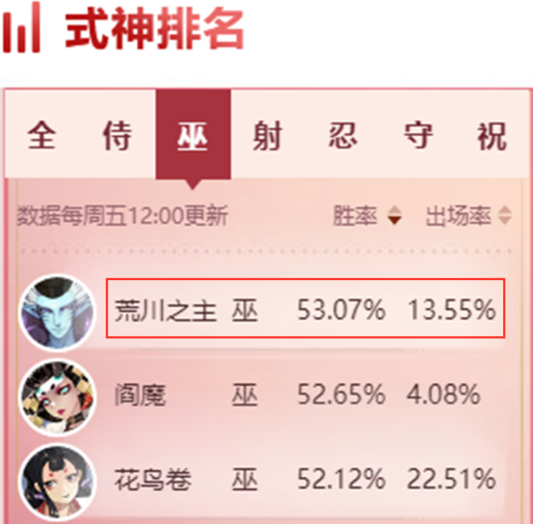 毋庸置疑,中单是团队的核心,一方面比赛的节奏基本靠中单与打野带,如果发挥失常,直接会影响到比赛的胜负;另一方面,中单承担着输出的重要职责,尤其在中后期的团战阶段,更是成为了主要的伤害来源。基于如今的游戏现状,中单成为了不可忽视的因素,不少玩家都会在这一位置花费大量心思。数据能够客观地描绘出式神的强度与近期表现,就中单来说,荒川之主凭借着53.07%的胜率、13.55%的出场率,位居中单榜首位。华丽的数据总能吸引众多的目光,最近几天总能看到荒川之主的身影。接下来文章将会从优劣势分析、技能、出装、阴阳术、实战技巧出发,多角度剖析荒川之主,希望能够还原他的真实面貌。