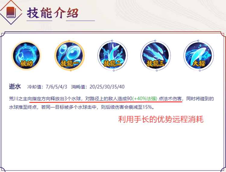 使用技巧:因为存在着伤害衰减的机制,即便近身贴面打也很打出高伤害。大多数情况下,荒川之主应该利用手长的优势远程消耗,通过命中不同目标可以将伤害最大化。因为水球之间的距离是相等的,智能施法以中部为基准,这会影响命中率,所以此技能建议手动施法。另外,一技能可同时穿过多个目标,对清兵很多帮助。