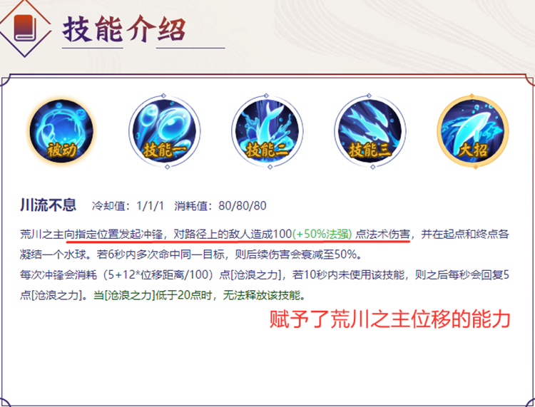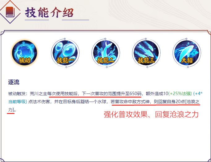 技能效果:每次使用技能后,荒川之主的普攻范围将会提升至650码,同时造成额外的法术伤害。需要注意的是,如果普攻命中敌方式神,则回复自身20点"沧浪之力"。
