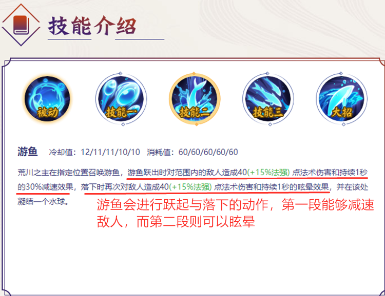 技能效果:荒川之主在指定位置召唤游鱼,游鱼会进行跃起与落下的动作。跃起时对范围内的敌人造成法术伤害并产生30%减速效果;落下时,同样造成伤害并眩晕1秒,并在该处留下一个水球。