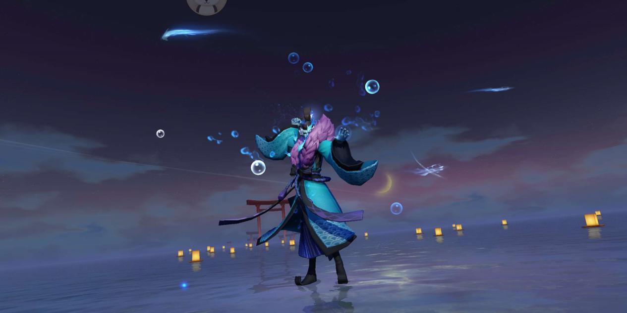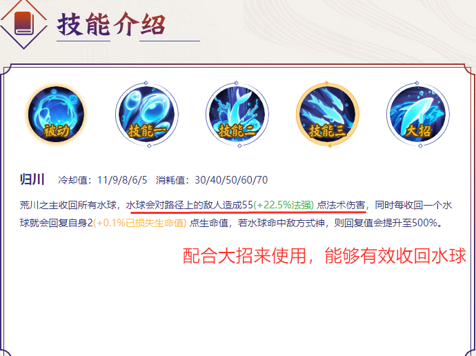 技能效果:荒川之主收回所有的水球,水球对路径上的目标造成一定的法术伤害。需要注意的是,每收回一个水球就会回复自身2(+0.1%已损生命值)点生命值,若命中式神,回复值提升至500%。
