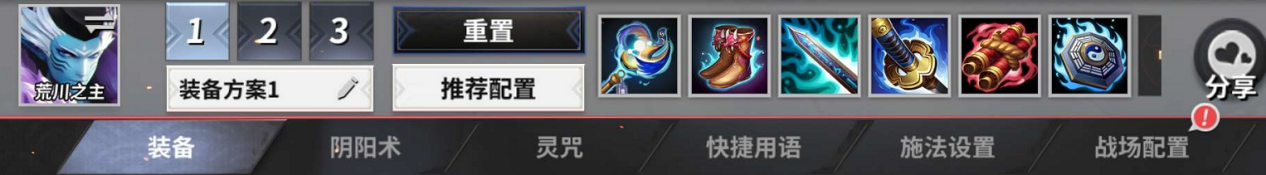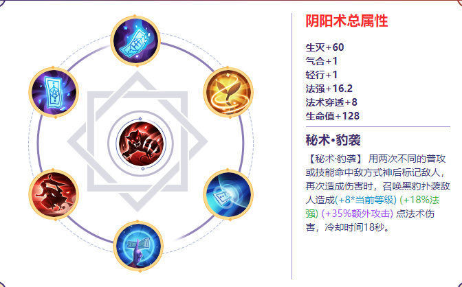 阴阳术方面,推荐上图这一套。首先,法强与法穿提升了荒川之主的输出能力,能够改善前期输出不足的情况;而生命值+128提升了式神的强度,前期对线时,也更有优势。阴阳术按照法系套路走就完全足够,可以应付大多数的战斗环境。