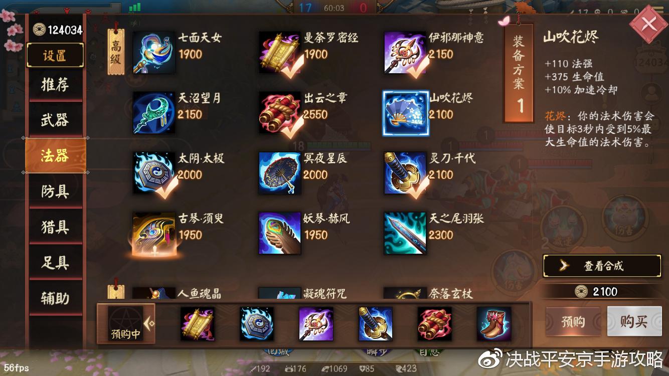 有替换空间的装备有山吹花烬和灵刀·千代这两件装备,如果对方的坦克位置比较强的话,这两家你装备就可以不用替换了,因为这个时候你的不足以打出一锤定音的伤害,因此需要通过灵刀·千代的法术吸血以及助攻回复生命值的效果打消耗战。同时,山吹花烬还有一定的持续伤害,可以用来消耗对方的血量。
