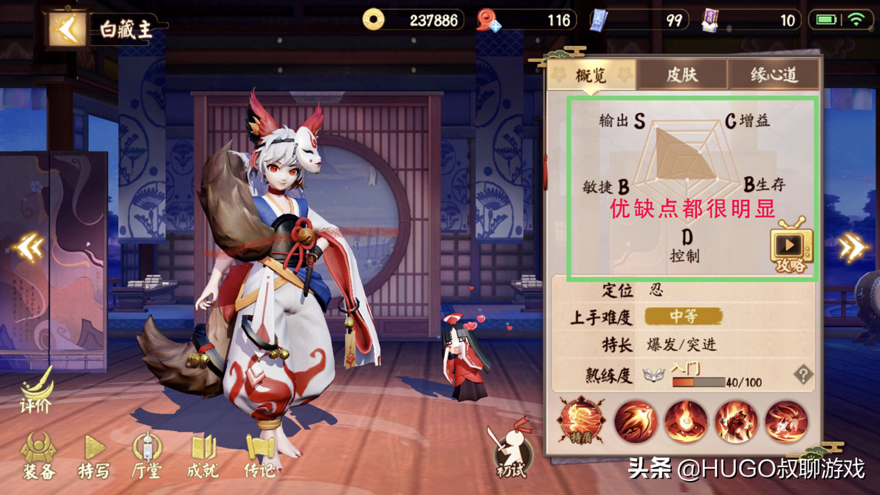 从白藏主的面板来看,他的输出为S,而控制为D。在忍类式神中,一样控制为D的只有山风,但人家可以无限连跳,白藏主一套打完,对面还不死,那死的就是自己了。因此更深入了解白藏主技能,才能让自己活得更久。