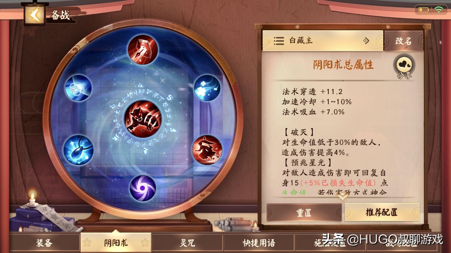 白藏主打野阴阳术建议如上图,以豹袭为核心,辅以法穿、法吸和冷却,如果觉得安全感不够,法吸和冷却都可以换成生命。技能槽是破灭、预兆星光和轻行。如果觉得白藏主蓝量不够,可以根据自己情况换成气合。
