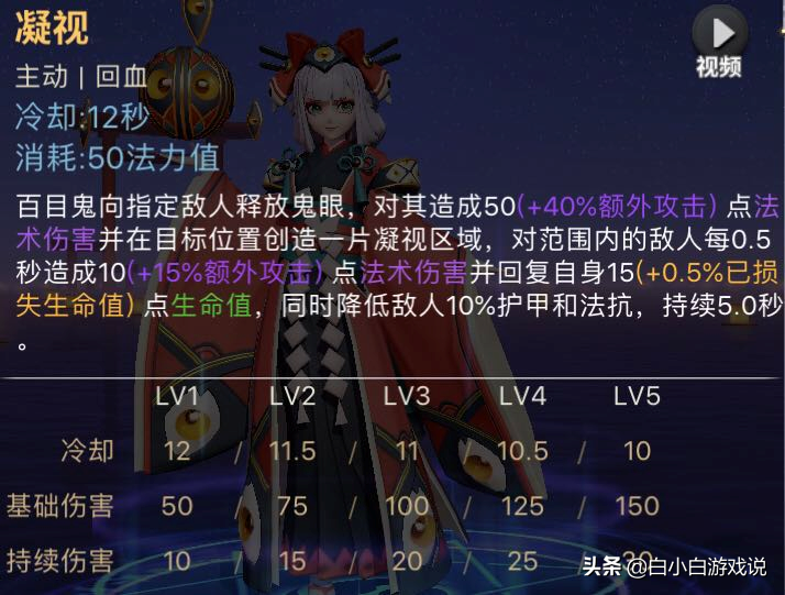期间百目鬼普攻敌人时,5个鬼眸会依次攻击该目标,每个造成(8(+1.5*当前等级)/24(+2.5*当前等级)/40(+3.5*当前等级) /50(+4.5*当前等级)/60(+5.5*当前等级)点法术伤害,伤害会在百目鬼的攻速到达130%/160%/190%/220%时提升。