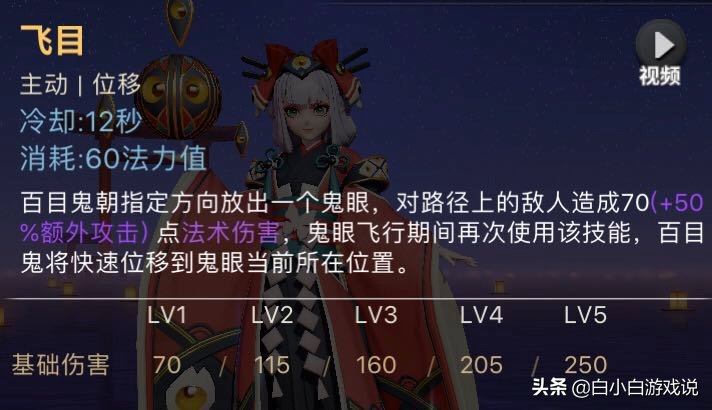 主动释放:百目鬼朝指定方向放出一个鬼眼,对路径上的敌人造成70(+50%额外攻击) 点法术伤害,4秒内再次使用该技能,百目鬼将快速位移到鬼眼当前所在位置。