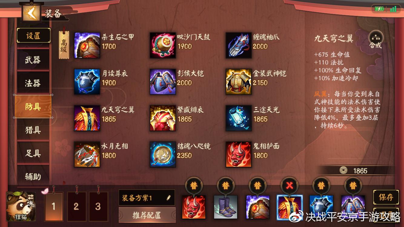 在装备的选择上,狸猫作为一个守类式神自然是越肉越好,不过由于守类式神需要根据局势走向针对性的出装,对方法术输出强就需要出法抗,物理输出强就需要出护甲,所以并没有完美的出装方案,因此这里就例举几个通用的装备。