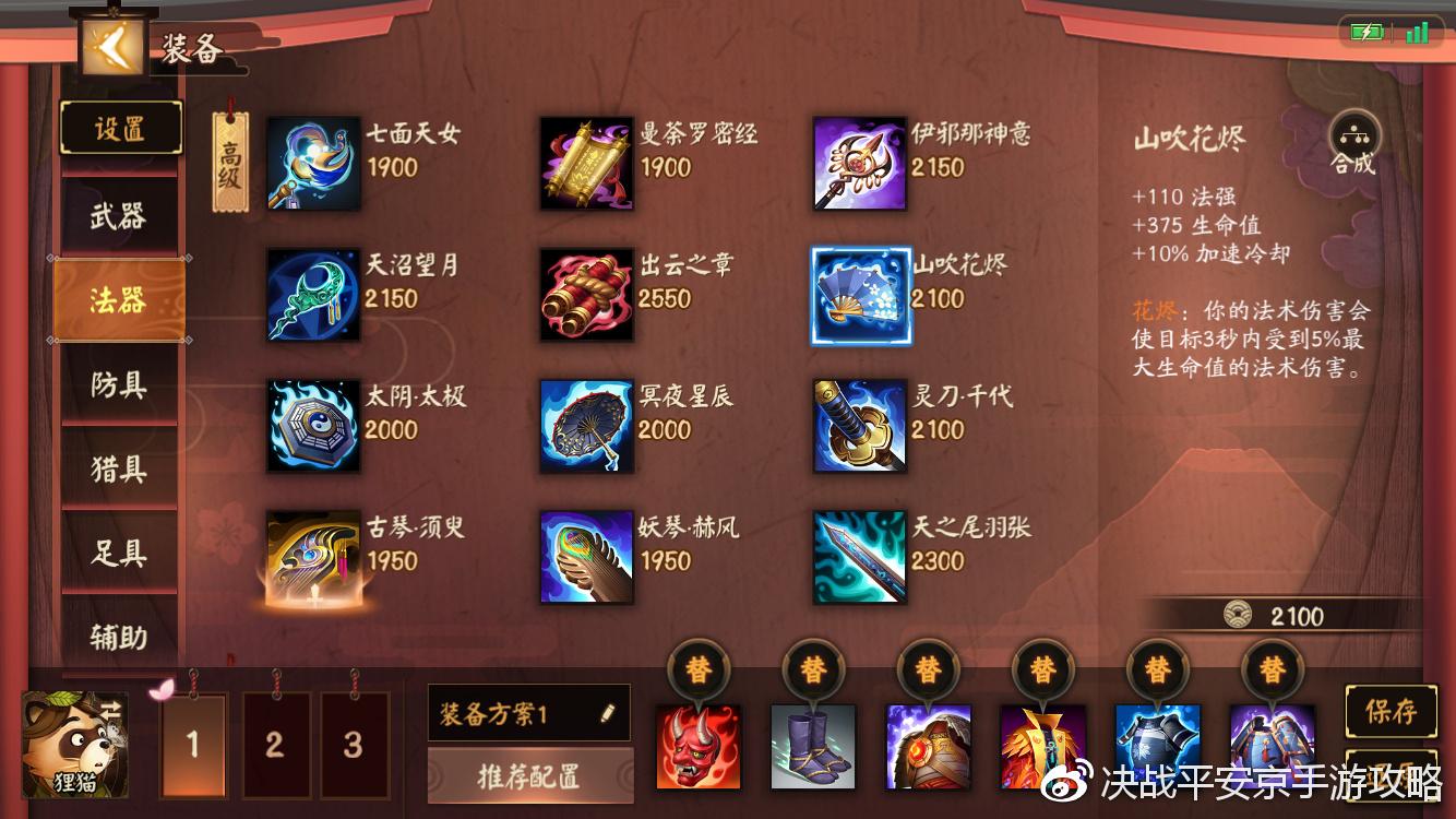 在选择装备的时候需要着重提升狸猫的冷却缩减属性,对于狸猫团战有多少贡献至关重要。并且,也有不少玩家按照系统出装选择了山吹花烬这件装备,这件装备属性加成确实不错,但是如果再己方的输出能力足够的情况下,这件装备的性价比就不是很高了,如果己方输出能力有所欠缺对方的输出不是非常高的情况下可以出这件装备,除了能提升冷却缩减属性和生命值外,法强属性的提升以及装备的被动效果都能够帮助狸猫在线上争取优势。
