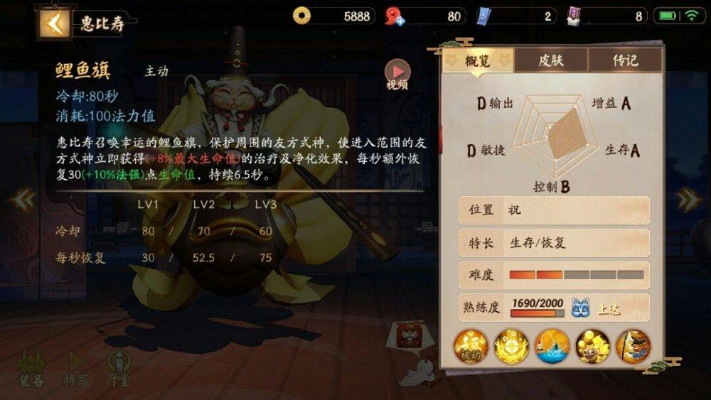 惠比寿的大招是召唤鲤鱼旗,并且能够让鲤鱼旗里的我方式神回血,这个技能对大之处在于解除控制,一旦队友陷入僵局,这个大招就有可能打破平衡,特别是那种地方控制技能交错人的局面下,这种情况可能会导致距离不够而让敌方导致无法追杀,甚至交出了更多技能而导致局面失利。